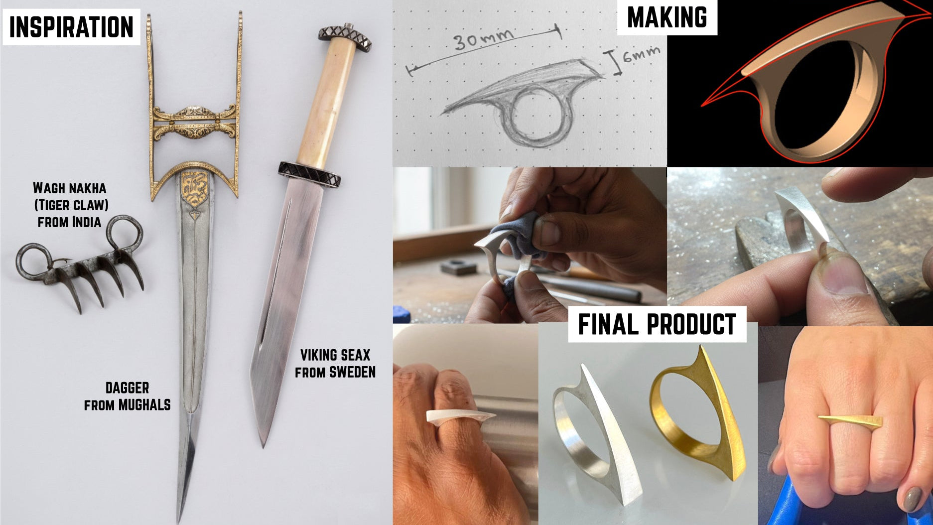 This ring, part of my Heritage Collection began by studying the commanding silhouettes of the Katar (Dagger), the stealth curves of the Waghnakh (Tiger Claw) & the clean spine of the Viking Seax. Each form was distilled, refined, and sculpted into a fierce modern design through meticulous 3D modeling and hand-finishing. The result is a contemporary piece that carries the quiet strength of three legendary weapons - reborn as wearable art.